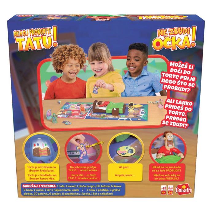 Na svom potezu baci kocku i pomakni se za određeni broj polja. Ako završiš na satu, pritisni sat pored kreveta nekoliko puta. Pazi da se tata ne probudi! Ako se probudi, moraš se vratiti na početak. Pobjednik je onaj tko prvi dođe do čokoladne torte u hladnjaku! Sadržaj: tata, krevet, ploča za igru, 20 žetona, 6 likova, 6 baza, kocka, list s naljepnicama, upute.