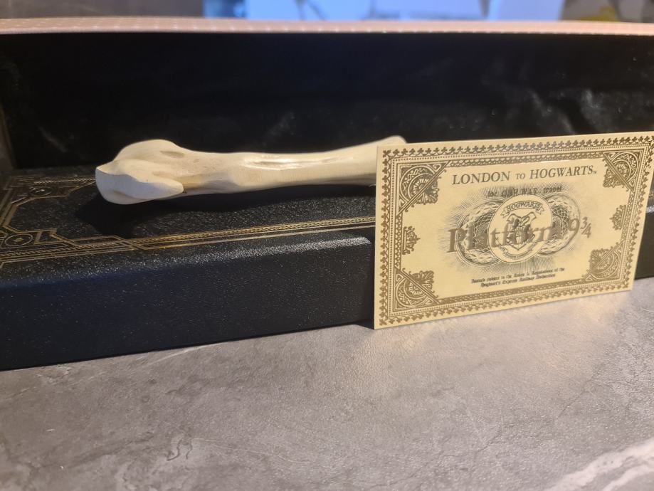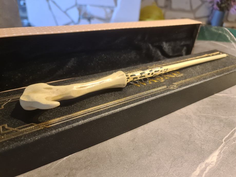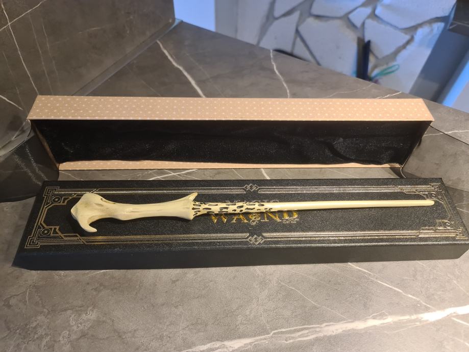 Kolekcionarski čarobni štap Lorda Voldemorta iz serijala Harry Potter, dužine 40 cm, izrađen od kvalitetne smole. Ova autentična replika vjerno prikazuje prepoznatljiv dizajn Voldemortovog štapa, poznatog po svijetloj boji, elegantnoj zakrivljenoj dršci i karakterističnom izgledu, baš kao u filmovima. Štap dolazi u elegantnoj kolekcionarskoj kutiji i savršen je poklon za kolekcionare, obožavatelje Harryja Pottera i sve ljubitelje najmračnijeg čarobnjaka čarobnjačkog svijeta. Nije igračka, već kolekcionarski predmet. Voldemortov štap poznat je po tome što dijeli jezgru s Harryjevim štapom, simbolizirajući povezanost dobra i zla, moć i sudbinu.