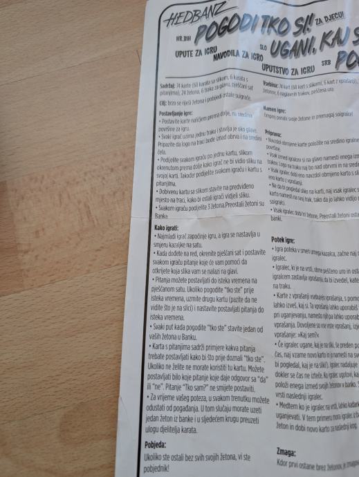 - 6 traka za glavu na koje se stavljaju kartice s pojmovima (slikama) koji se pogađaju,
