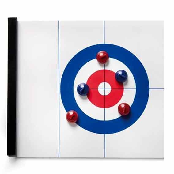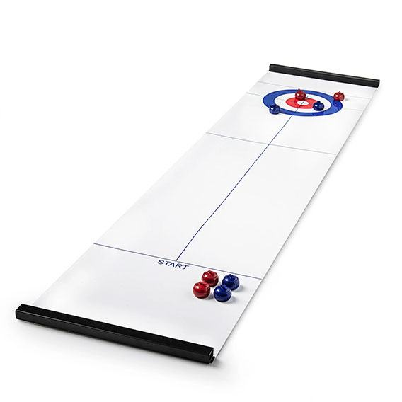 Curling igra je igra na ploči sa sjajnom, laganom i roll-up stazom. Jednostavna je za prenošenje jer je staza početno uvučena u plastične držače. Kada želite zaigrati ovu igru jednostavno stazu "odrolate" za čvrstu podlogu i možete započeti s igrom. Uključuje 4 plave i 4 crvene kuglice za 2 tima. Curling je stari nacionalni škotski sport nastao u 15. stoljeću, a od 1998. godine uvršten je i kao zimski olimpijski sport. Uživajte u svom toplom domu igrajući ovu zabavnu igru!
