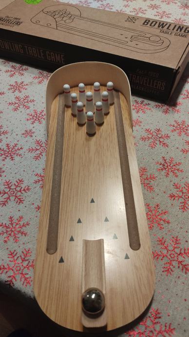 Zabavna igra za djecu i odrasle, kuglanje u malom. Prigodno za putovanja, odmor i razonodu u vrijeme obiteljskih okupljanja.