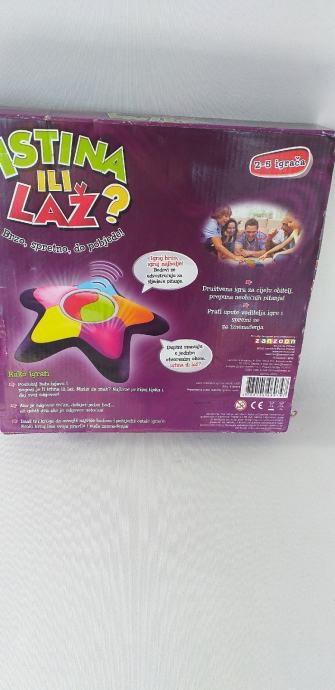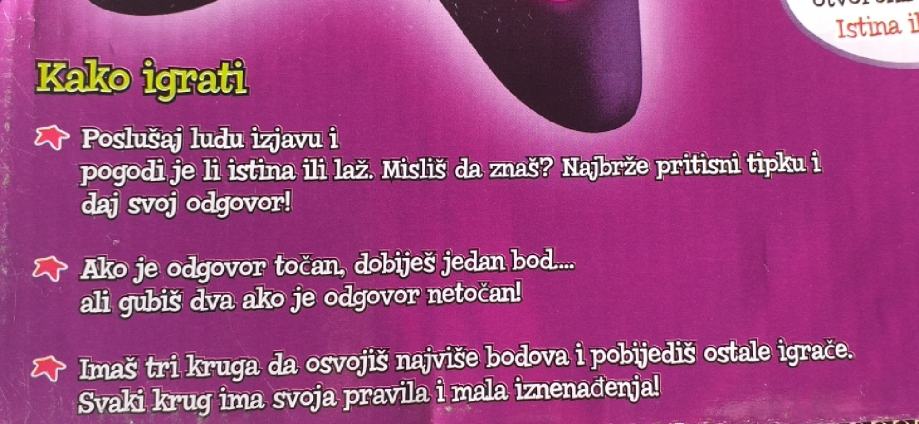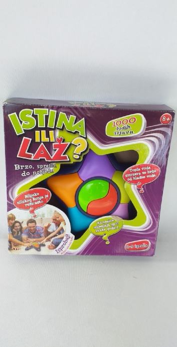 Društvena igra za cijelu obitelj, prepuna neobičnih pitanja! Za 2 do 5 igrača. Poslušaj ludu izjavu i pogodi je li istina ili laž. Misliš da znaš? Najbrže pritisni tipku i daj svoj odgovor! Ako je odgovor točan, dobiješ jedan bod….ali gubiš dva ako je odgovor netočan! Imaš tri kruga da osvojiš najviše bodova i pobijediš ostale igrače. Svaki krug ima svoja pravila i mala iznenađenja! Dob: 8+.MOLIM NE ŠALJITE PORUKU PREKO NJUŠKALA,