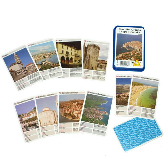 Igraće karte za Kvartet, Lijepa Hrvatska. Kvarteti sa hrvatskim gradovima, otocima, prirodnim spomenicima, opis znamenitosti na hrvatskom i engleskom jeziku. Zabavna kartaška igra za djecu i odrasle. Djecu uči učinkovito koristiti kombinacijske vještine, a također razvija logično razmišljanje. Pobjednik je igrač koji je na kraju igre sakupio najviše kvarteta.