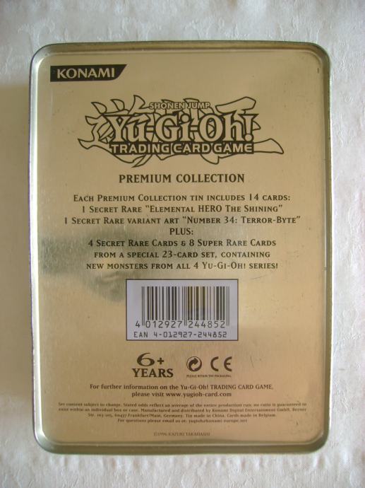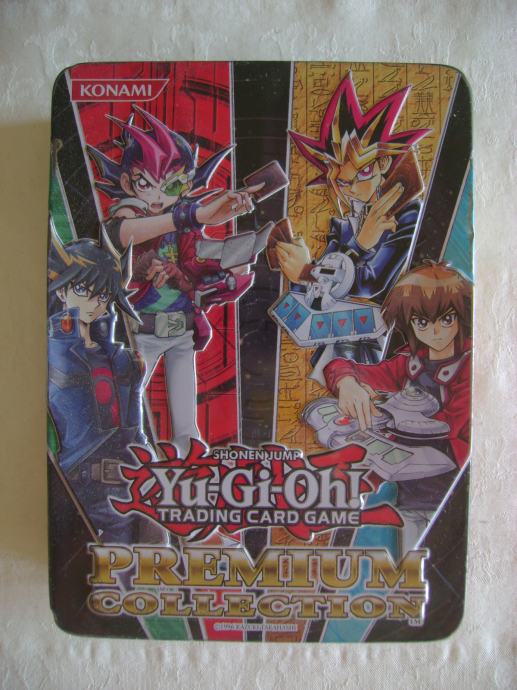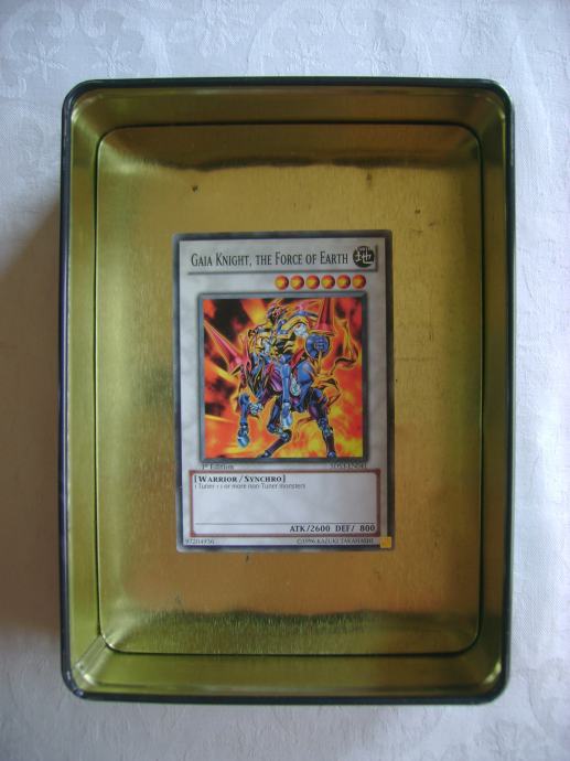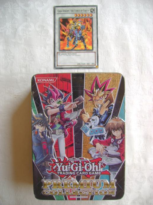 Limena kutija Yu-Gi-Oh Trading Card Game - Premium Collection - dimenzije cca 11 x 15 x 4, cm, prazna, vrlo dobro do odlično očuvana + karta Gaia Knight, The Force of Earth - stanje je vidljivo na slikama.