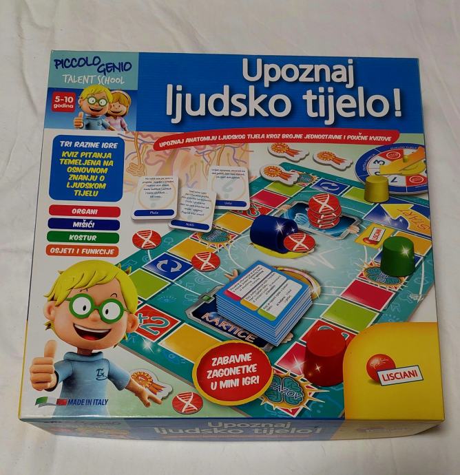 Prodajem društvenu igru Upoznaj ljudsko tijelo od proizvođača Lisciani, iz serije Piccolo Genio Talent School. Igra je namijenjena djeci od 5 do 10 godina i donosi tri razine igranja kroz kviz pitanja temeljena na znanju o ljudskom tijelu, s temama poput organa, mišića, kostura te osjeta i funkcija.