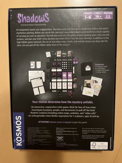 Kooperativna društvena igra "Masters of Crime: Shadows". Igra je u odličnom stanju - jednom odigrano, sve komponente su sačuvane i vraćene u početno stanje, karte su vraćene u originalni poredak.
