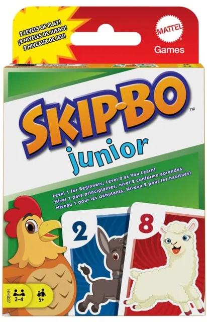 Skip-Bo™ Junior Card Game is the ultimate sequencing card game from the makers of UNO® Card Game that features simplified game play and kid-friendly design, with bright colors and animal graphics. And with this edition, there are 2 levels! Players use skill and strategy to create sequential stacks of cards from a 1-card stack up to a 10-card stack in the center playing area, and the first player to use all the cards in their stockpile wins. The second game level adds discard piles to the mix, so kids can challenge themselves as they get better at the game. Makes a great gift for card-loving kids ages 5 years and older. Colors and decorations may vary.In this sequencing game, players stack cards from 1 to 10 in the center playing area, using cards from their stockpile.A second level comes with this game that adds discard piles to the mix, for kids who have mastered the basic game. Creating sequential stacks uses counting skills as well as game playing strategy.The cards are designed in bright colors with charming animal graphics that add to the fun!Kids ages 5 years and older can play, with 2 to 4 at the table. The oldest player is the dealer and the youngest goes first.Makes a great gift for kids who love card games.