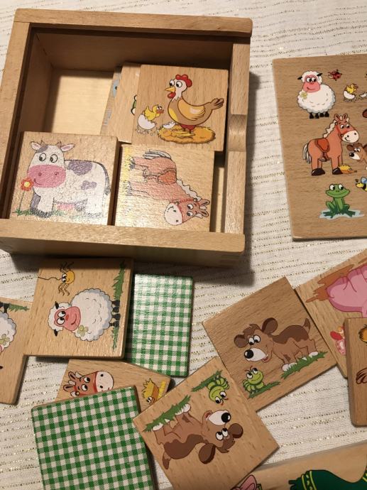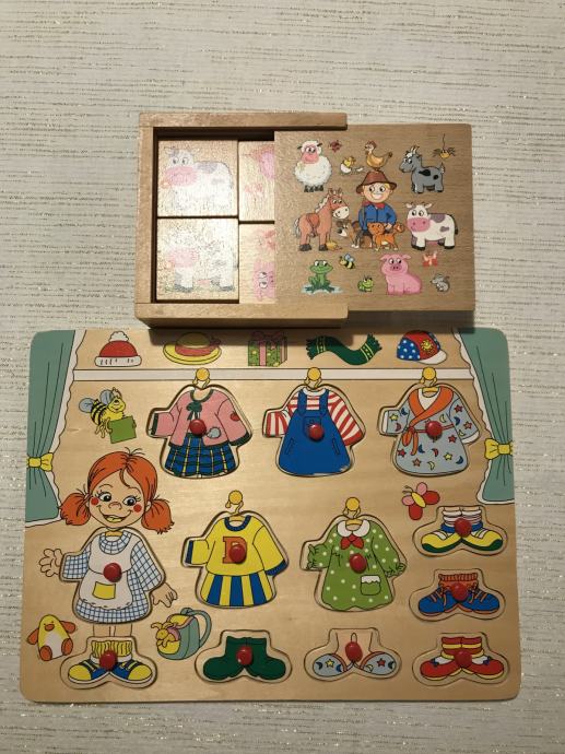 Drvene didaktičke igračke, u odličnom stanju, memory i obuci djevojčicu. Memory sa životinjama s farme - 20 pločica Svi dijelovi su tu. Svaka po 6€ Zajedno 10€