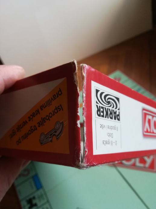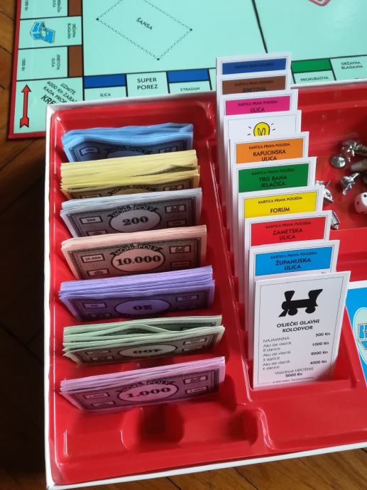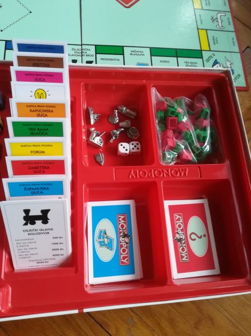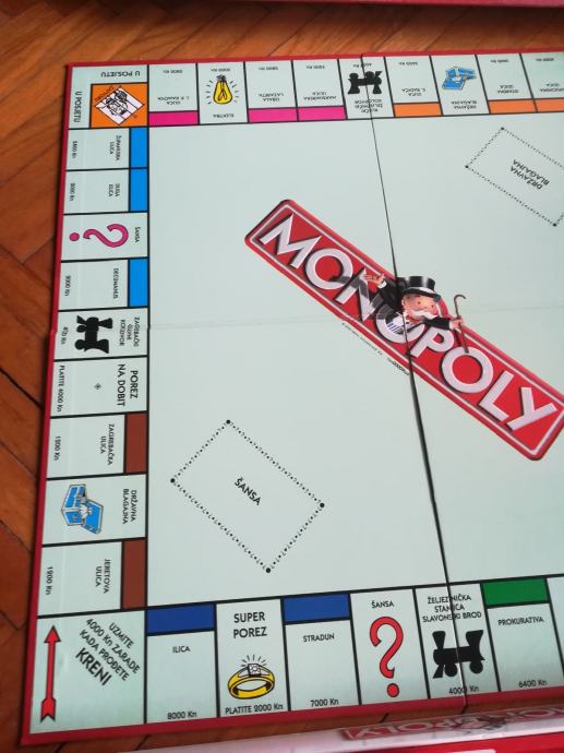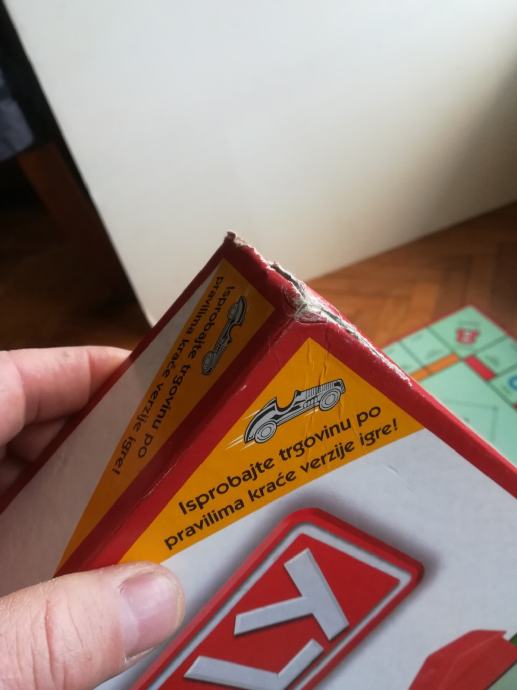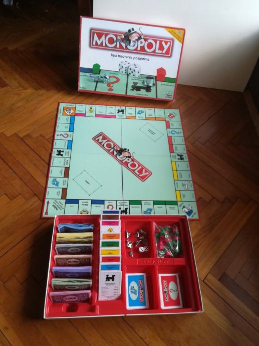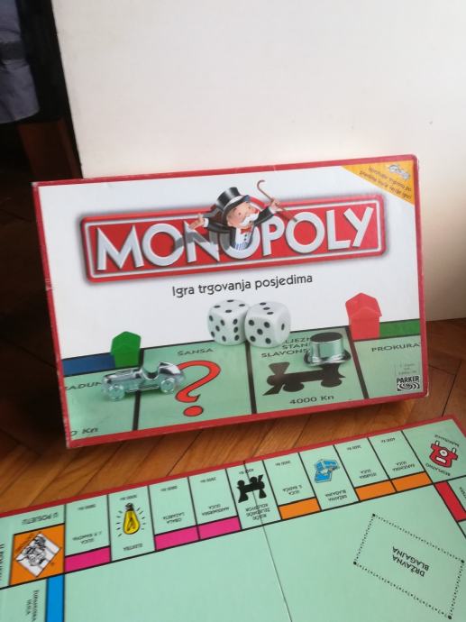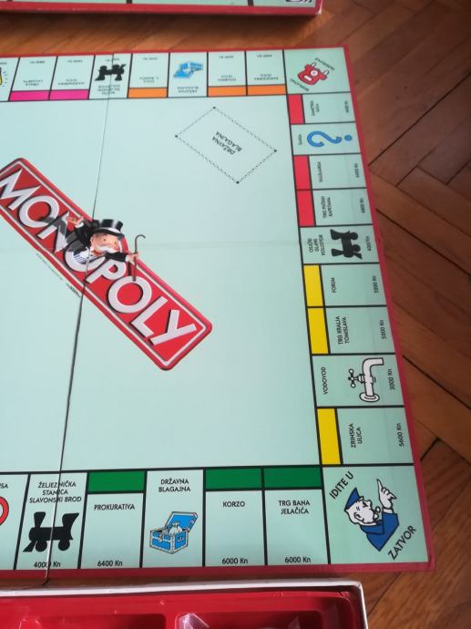 Društvena igra Monopoly hrvatsko izdanje. Sve kartice, figurice, kućice i novčanice su na broju. Jedino je kutija malo oštećena (na zadnje dvije fotke možete vidjeti oštećenje). Cijena je fiksna. Na sms nemogu odgovoriti, najbolje bi bilo da me nazovete 099 687 5657 ili pošaljete poruku preko Njuškala.