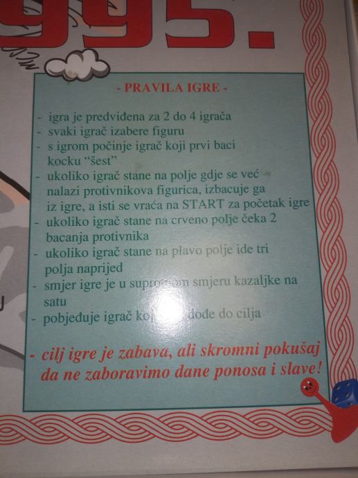 Mogu se igrati četiri igrača, a svaki dobije figuricu i baca kocku. Ovisno o broju, zauzima polja na ploči, a start je u okolici Hrvatske Kostajnice. Ako igrač stane na protivničko polje, izbacuje ga se iz igre. Uz mjesta kojima je prolazila hrvatska vojska, ucrtani su tenkovi, neprijateljski vojnici, ali i hrvatski vojnici koji su prikazani kao veći, jači i opasniji od neprijateljskih. Pobjednik igre je onaj koji prvi uspije doći do Knina.