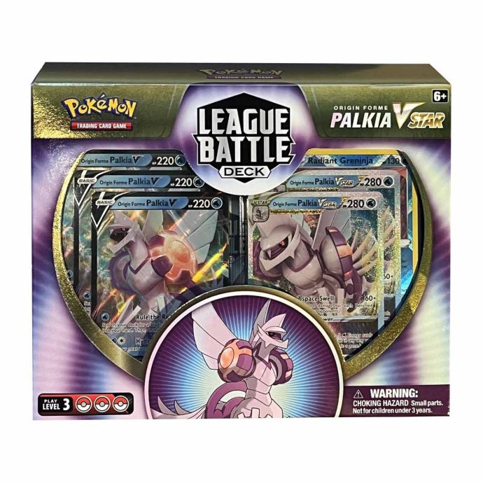 U setu: 1 špil od 60 karata spreman za igru s nizom moćnih karata, 3 folijske kartice s oblikom podrijetla Palkia V, 2 folijske kartice s Origin Forme Palkia VSTAR, 1 folijska kartica s Radiant Greninjom, 1 kutija za špil, 2 markera za označavanje stanja žetona, 6 kockica za brojanje štete i 1 kockica za bacanje novčića prema pravilima za natjecanje, 1 akrilni VSTAR marker, 1 list strategija, 1 kodna kartica za online igru.