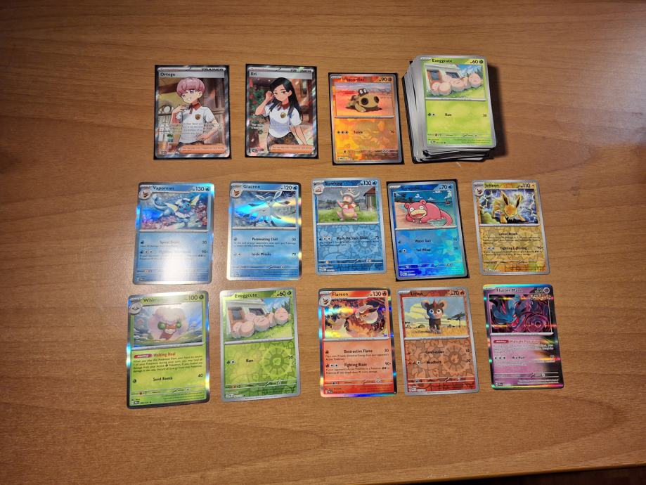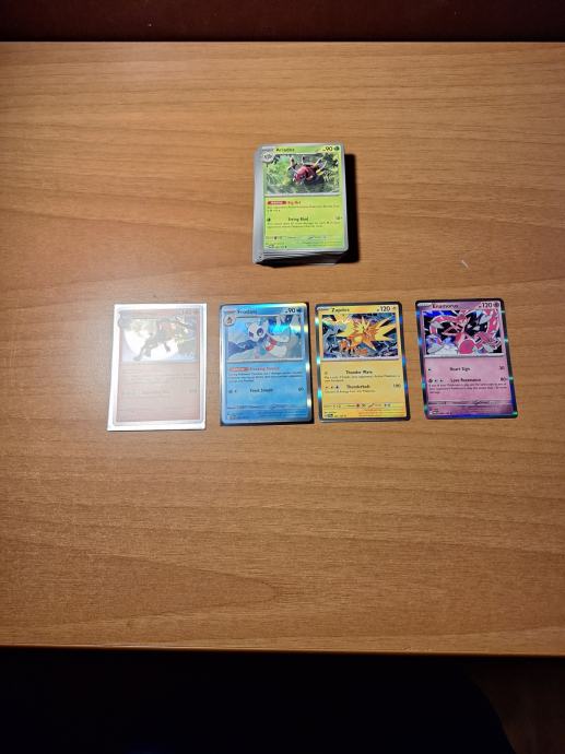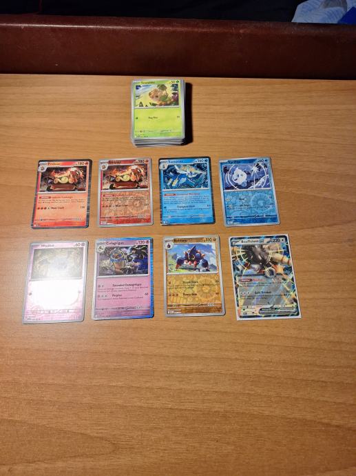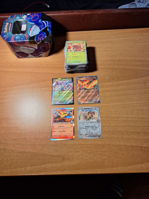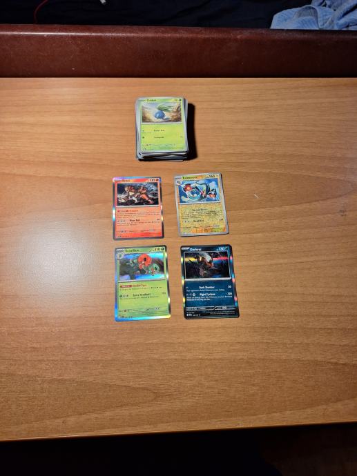 Poštovani, prodajem veliki lot Pokemon karti sa razno raznim dodatcima.Karte su original, izvađene iz boostera, ETB itd.. ove godine te odmah nakon otvaranja spremljene što znači da je stanje NM. Ne prodajem pojedinačno. Popis niže, moguća zamjena za neotvorena pakiranja Paradox Rifta ili Mege ili Phantasmala. Inzistiram na osobnoj primopredaji. Nisu sve karte slikane zbog elementa iznenađenja, nema duplih karata i ima nešto više energy i redeem karata jer nisam baš sve naveo u popisu.