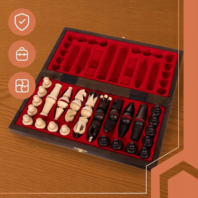 Jeste li obožavatelj bezvremenske šahovske igre i cijenite svoju sofisticiranost? Naš vrhunski drveni tapecirani šahovski komplet s dimenzijama 31x31 cm i kvalitetnim figurama od drva savršen je izbor za sve koji traže kombinaciju elegancije, funkcionalnosti i vrhunske kvalitete. Ovaj šahovski set nije samo igra, već i umjetničko djelo koje će ukrasiti svaki prostor i pružiti bezbroj sati intelektualne zabave.