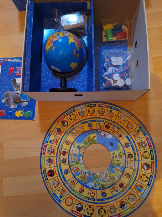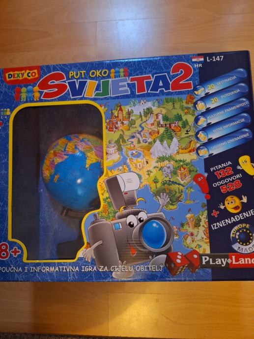 Društvena igra Put oko svijeta, za djecu od 8 godina. U kompletu se dobije globus, ploča za igranje, kartice sa pitanjima i odgovorima, figurice...sve u odličnom stanju, kao novo