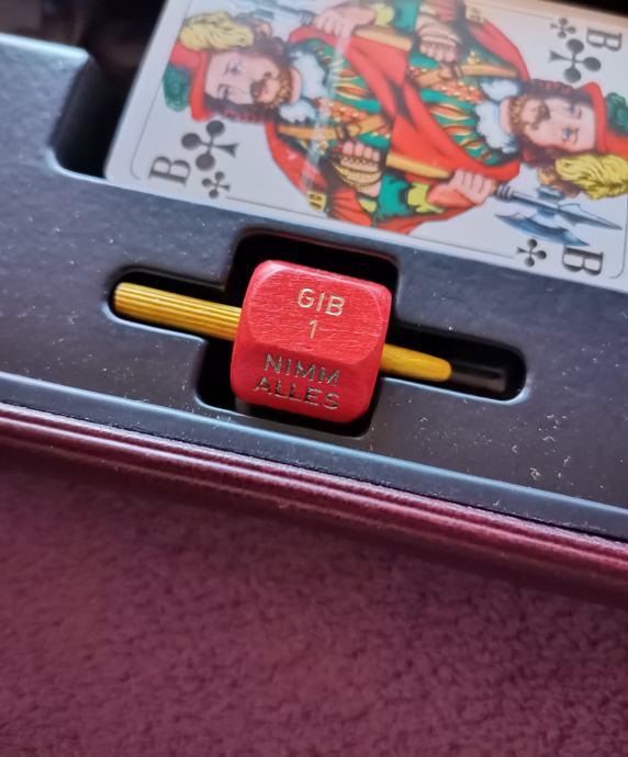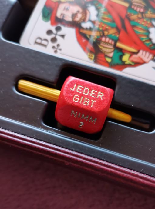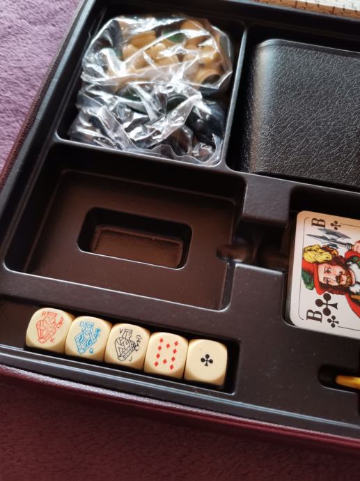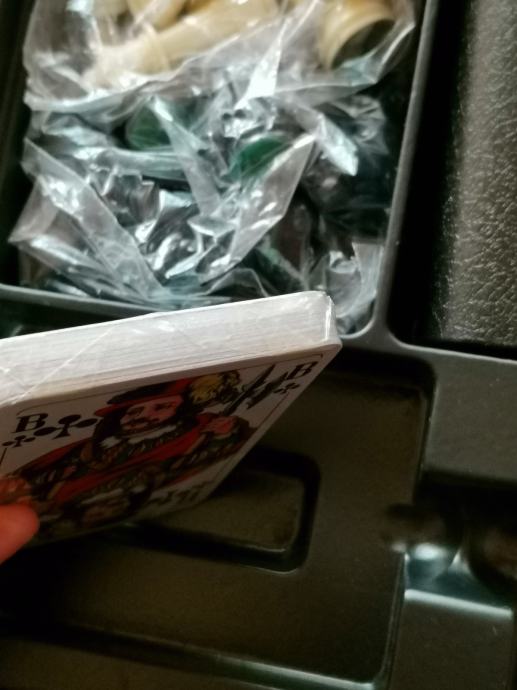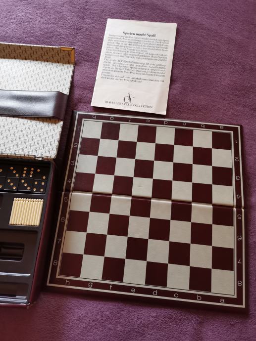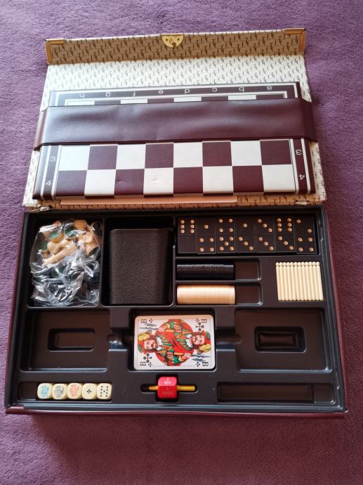 Set uključuje šah, dame, zapakirani špil igraćih karata, igre s kockicama i domino.