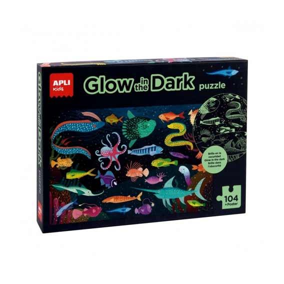 Slagalica s motivom oceana koja "sjaji u mraku" (fluorescentna). Uključuje 104 dijela veličine 5 x 5 cm. Veličina slagalice: 64.5 x 41.5 cm. Nakon što se slagalica složii, djeca će moći isključiti svjetlo kako bi vidjela kako ribe sjaje i otkrila razlike koje postoje! Ekskluzivni APLI Kids dizajn: djetinjast, šaren, jasan i jednostavan. Jednostavno rukovanje za mališane: čvrsti, sigurni i jednostavni dijelovi.