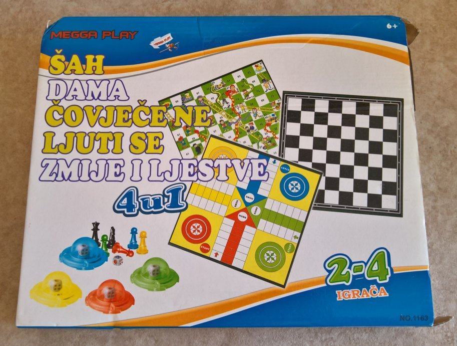 Društvena igra, 4 u 1, a igre su: šah, dama, čovječe ne ljuti se, zmije i ljestve. Ove igre posebno su pogodne za igru u kući, Kutija nije uopće