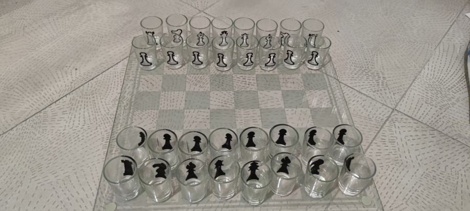 Prodajem šah sačinjen od staklenih čašića koju samu igru šaha mogu učiniti zanimljivijom