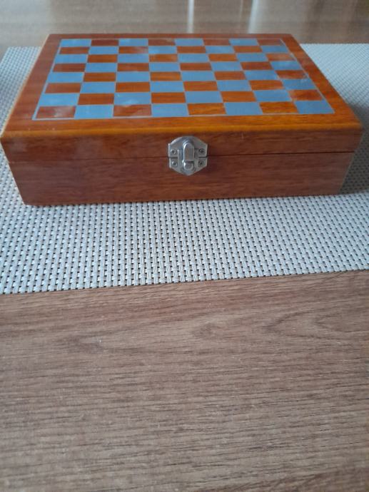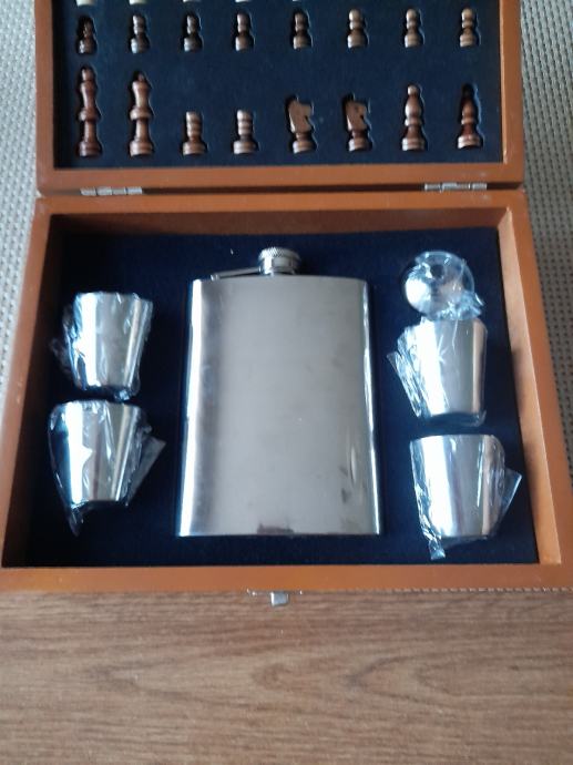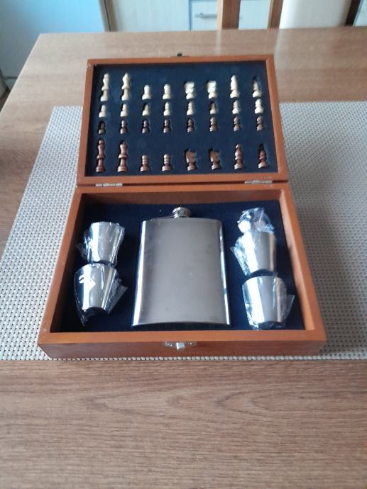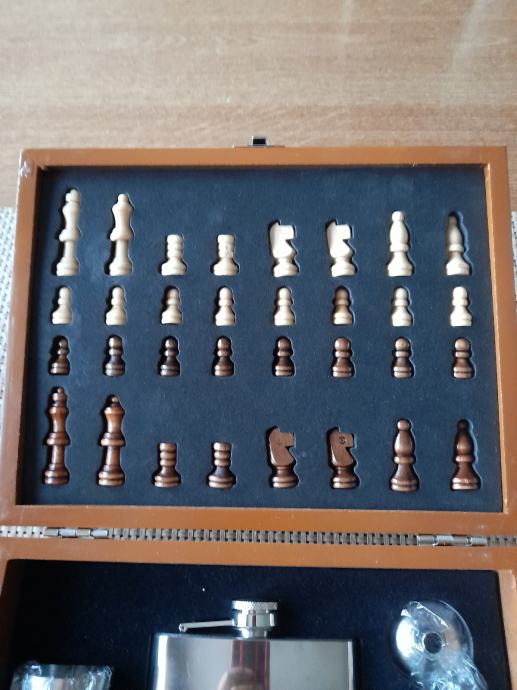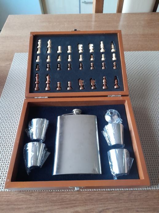 Prodajem novi šah u drvenoj kutiji sa pljoskom i 4 casice, dimenzije kutije su 24x18 cm, praktican za putovanje , cijena 30 € saljem tiskom .Inf na tel