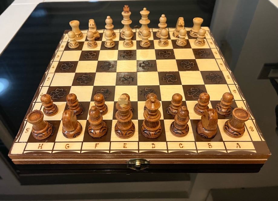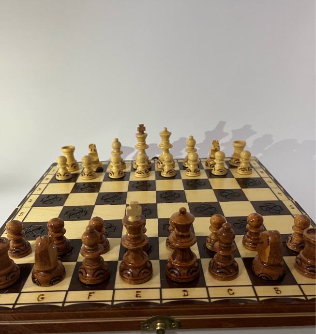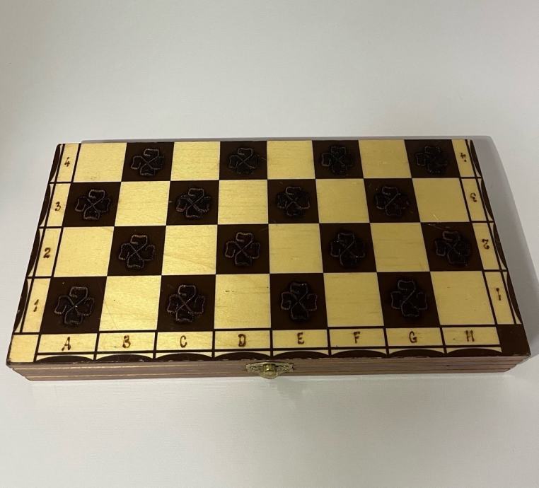 Prodajem drveni šah ručne izrade. Ploča i figure izrađene su od drva, a tamna polja ukrašena su urezanim motivima djeteline što ovom šahu daje poseban, rustikalan izgled. Figure su ručno oblikovane u dvije boje, svjetlijoj i tamnijoj, s detaljno izrezbarenim osnovama. Ploča se preklapa poput kutije u kojoj se pohranjuju figure, praktično za odlaganje i nošenje. Oznake redova i stupaca ugravirane su uz rubove ploče.