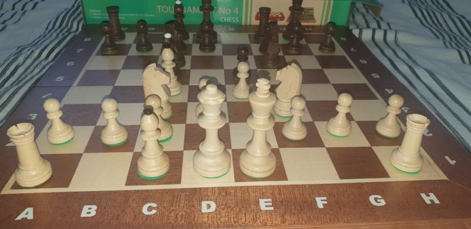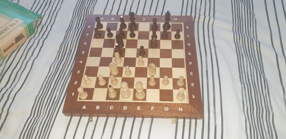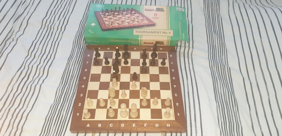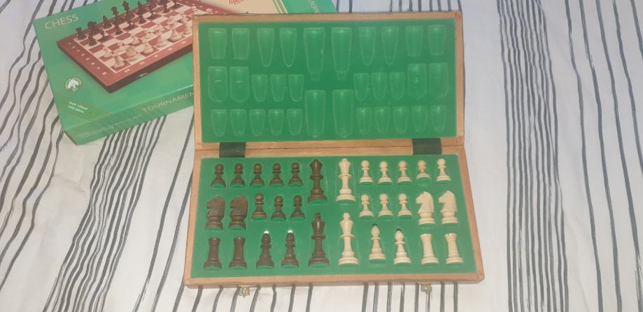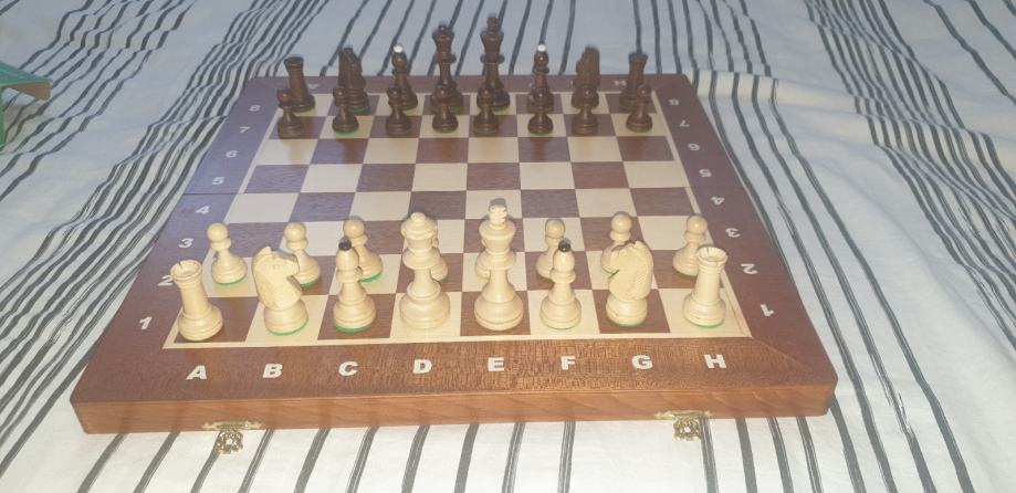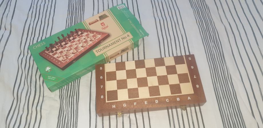 Prodajem Novi ljepi sah srednje velic.38×19×4,5 od drva mahagonija i platane i sa umetcima za figure:( staunton no.4.izradjene od drva grab, visina kralja 7,8cm)