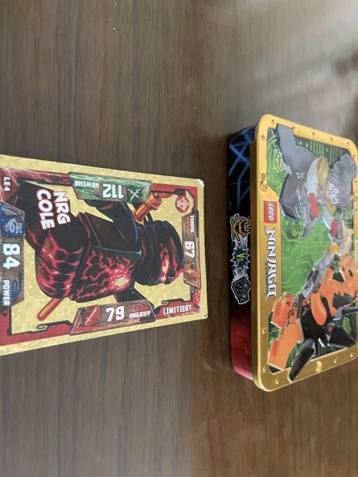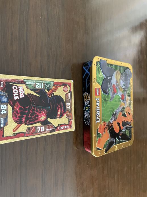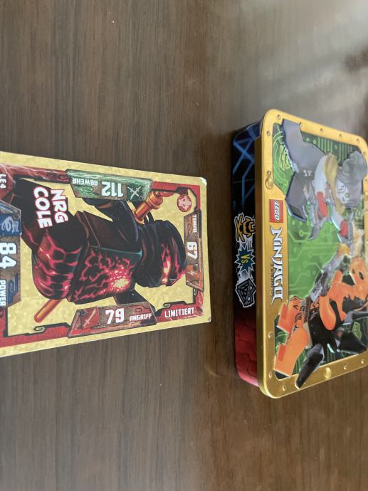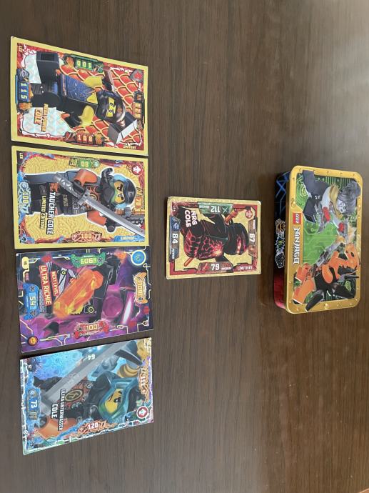 Prikazana kolekcija sadrži razne LEGO Ninjago kolekcionarske karte i metalnu kutiju s figuricama, uglavnom fokusirane na lik Colea.