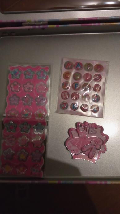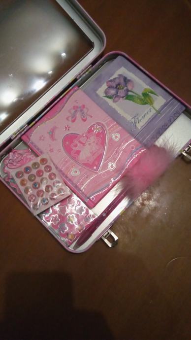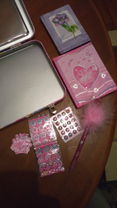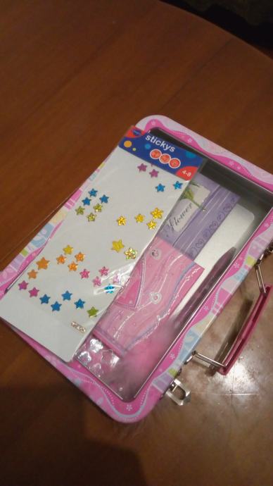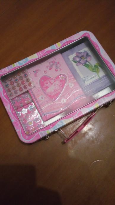 Prodajem set za pisanje i ukrašavanje za djevojčice, sastavljen od bilježnica, kemijske, naljepnica, po cijeni od 4 eura za sve.