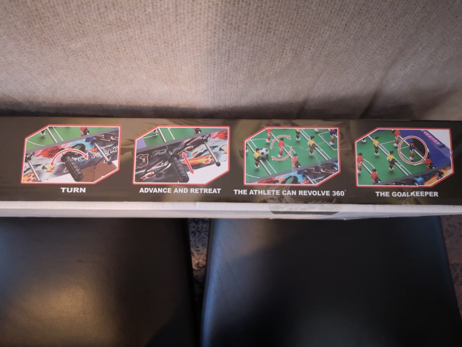 Svaki tim ima po 9 igrača(figura), po 3 na svakoj ručki. Svaki igrač (figura) se okreće za 360˚. Ploča, odnosno nogometno polje, je izrađeno od materijala koji je otporan na ogrebotine i ne skuplja prašinu, što vam omoguće dugotrajno korištenje i minimalnu brigu oko održavanja.