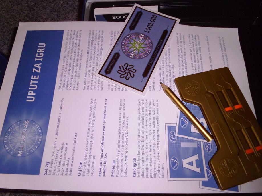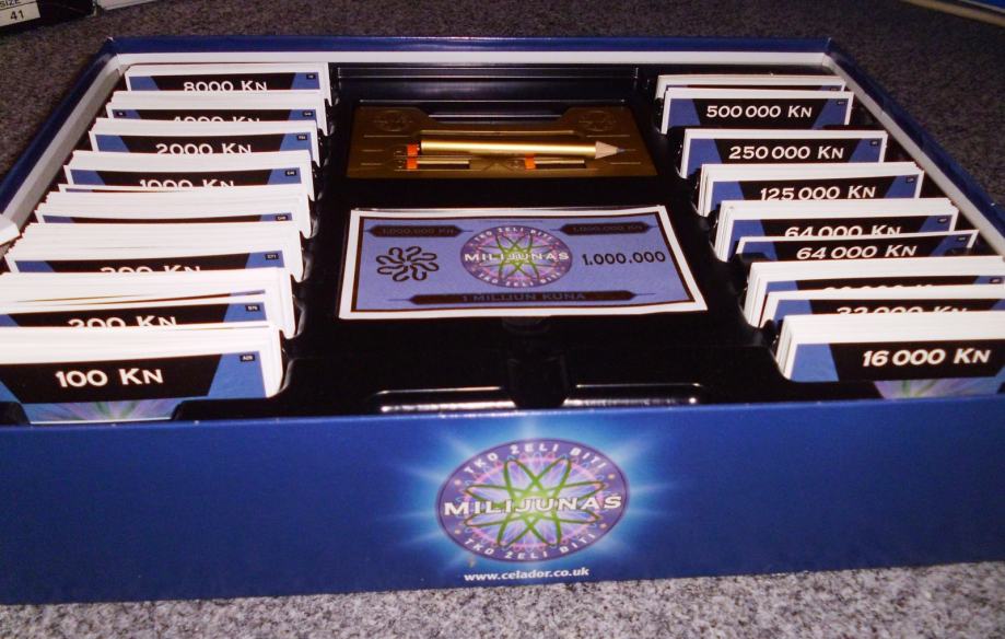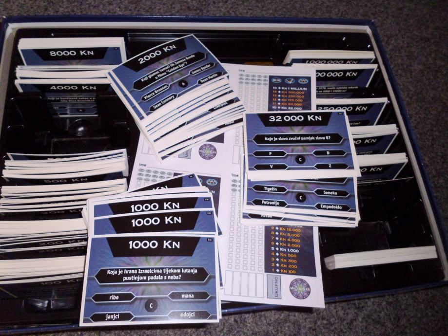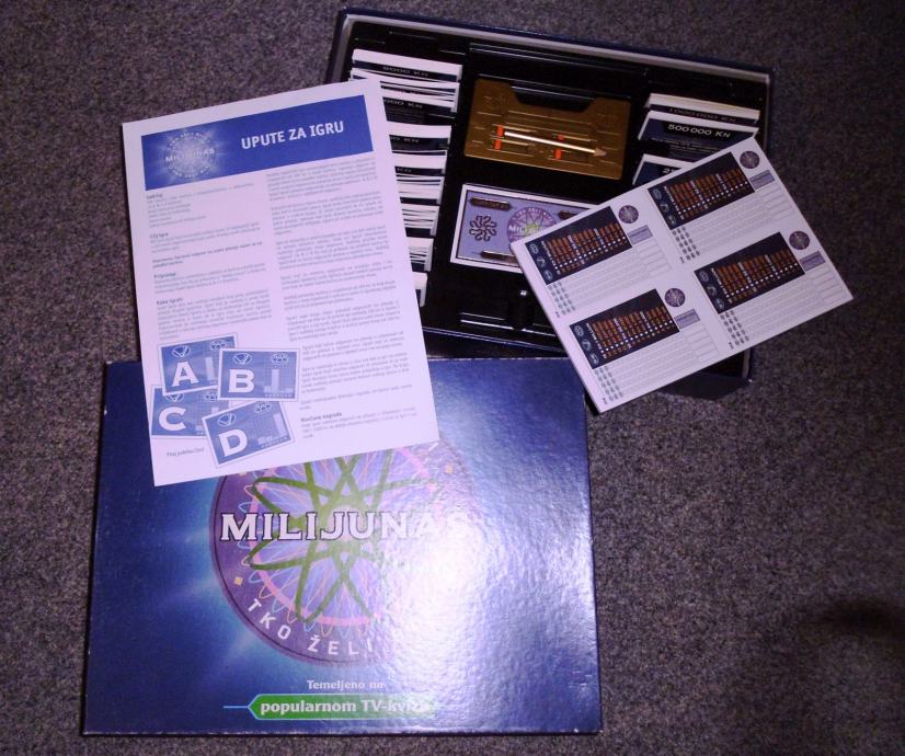 Društvena igra "Tko želi biti milijunaš?" u izdanju Turbo Limača. Rabljena tek nekoliko puta, kao nova, sve kartice i jokeri su na broju skupa s uputama za korištenje, blok za bodovanje i originalna olovka nekorišteni. Sve u odličnom stanju, poklopac kutije oštećen na jednom kutu u transportu.