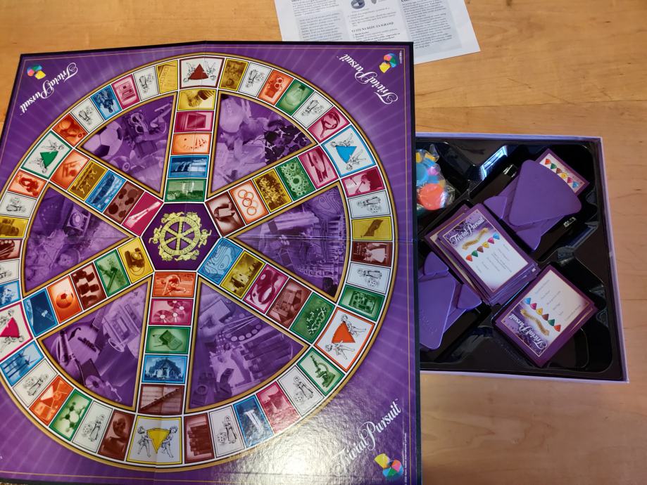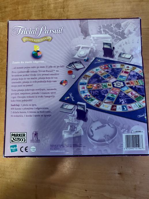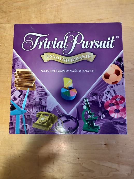 Prodajem dobro očuvanu društvenu igru Trivial Pursuit, osnovno izdanje na hrvatskom jeziku. U kutiji se nalazi očuvana podloga za igru, figurice i kartice s pitanjima i odgovorima te pravila za igru.