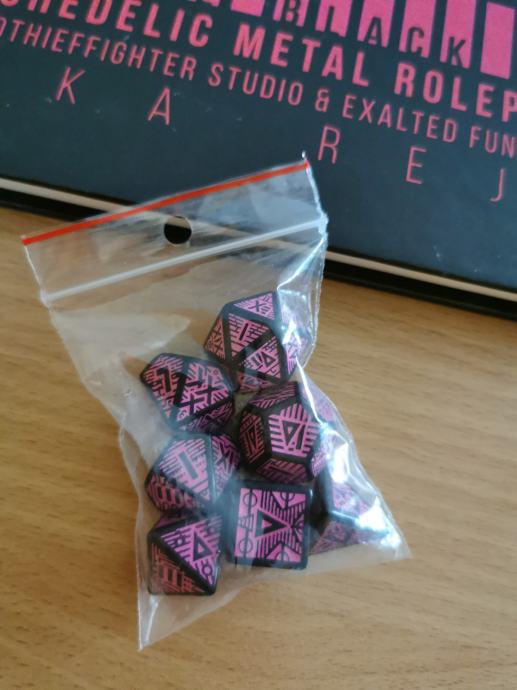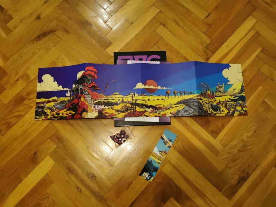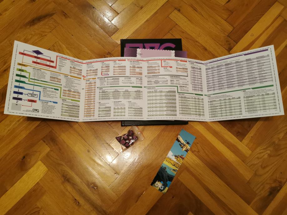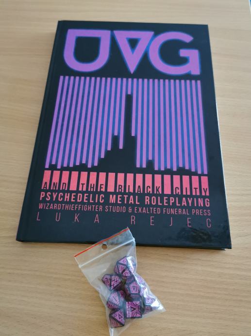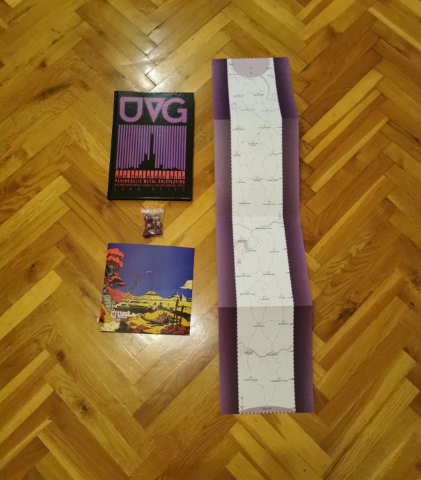 Kickstarter edition: UVG hardcover, UVG bookmark, pink & black dice, UVG gatefold GM screen, UVG vertical fold out map.