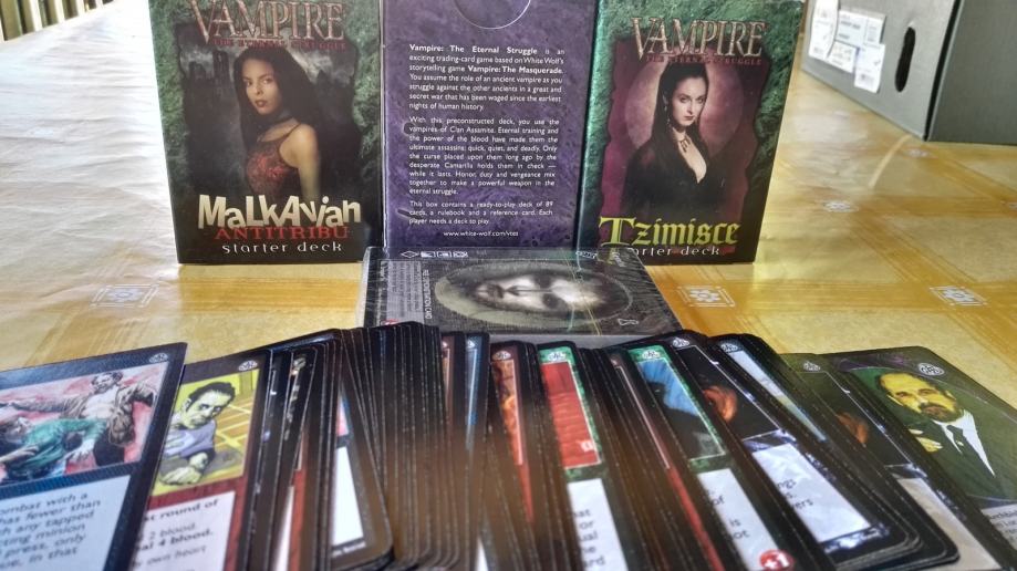 Prodajem tri starter decka (i jedna bonus pack) jedne od najboljih kartaških igara svih vremena. Duboka, kompleksna i pršti temom. Klanovi su Malkavian, Assamite i Tszimisce. Kultnu igru je dizajnirao Richard Garfield- tvorac Magica i Netrunnera. Sve karte su savršeno uščuvane.