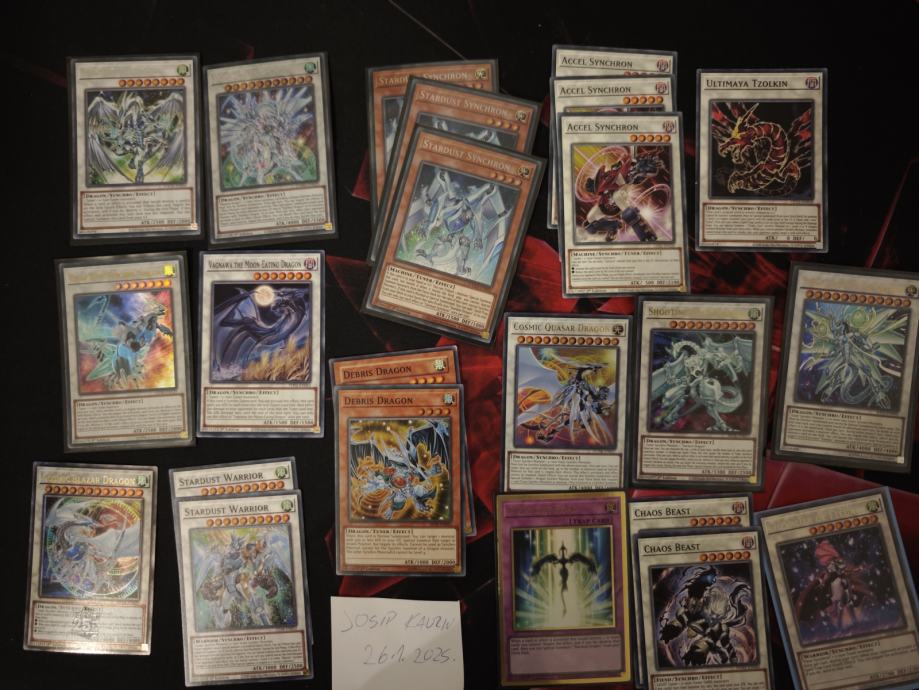 Prodajem yugioh kolekciju(ne odvajam),6 tineva razvrstanih karata,tin common/ultra/super rare ,corovi poput elemental hero,d/d, d/d/d,stardust dragon, crystal beast,harpies i mnoge druge,singlice poput red eyes-yapi...ima jako puno slika,ostatak slika saljem u inbox