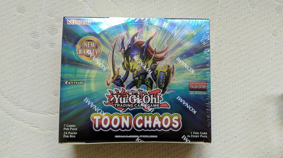Prodajem Yugioh booster box Toon Chaos. Box je 1st edition na engleskom jeziku, zatvoren naravno. Sadrži 24 paketića od 7 karata. Svaki paketić ima 6 rare karata i 1 foil kartu. Box ne otvaram i ne prodajem zasebno paketiće! Moguća je i djelomična zamjena za karte, ali samo mal skuplje. Preuzimanje moguće u Zagrebu.