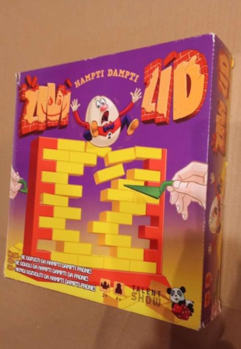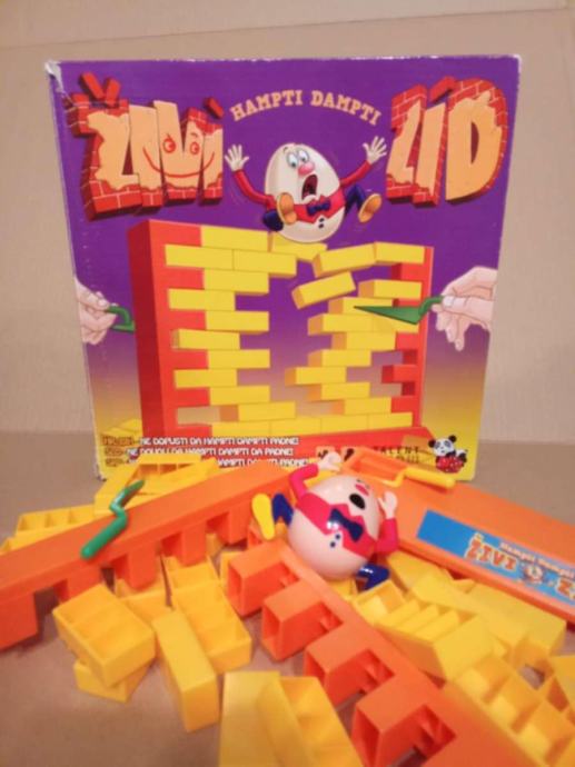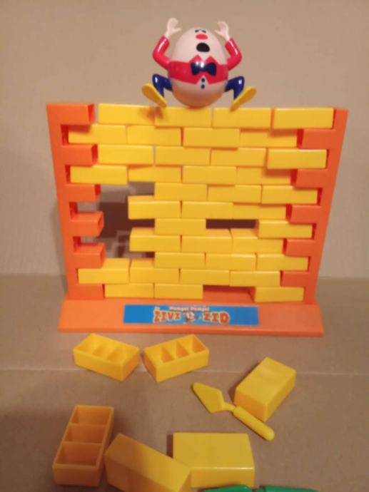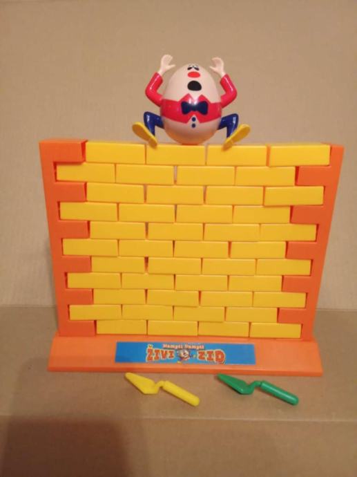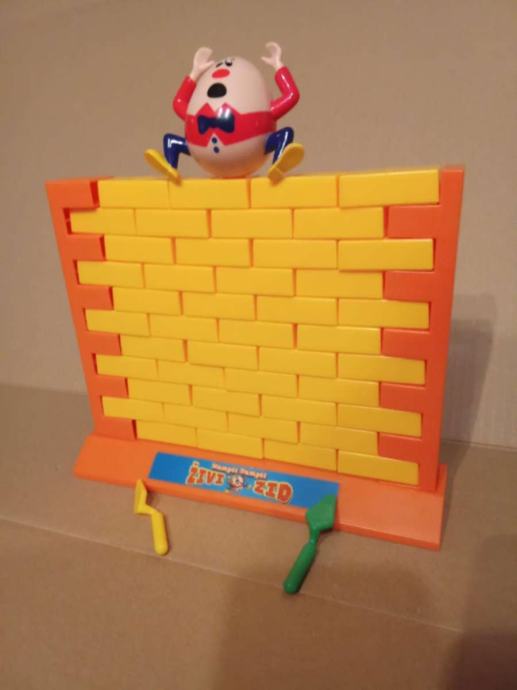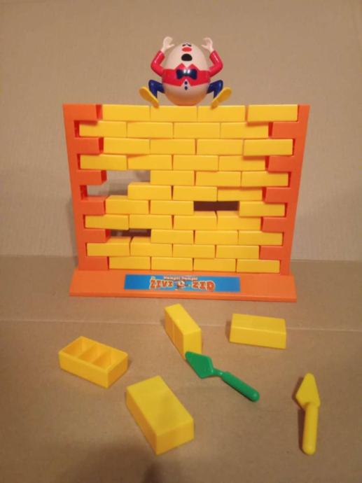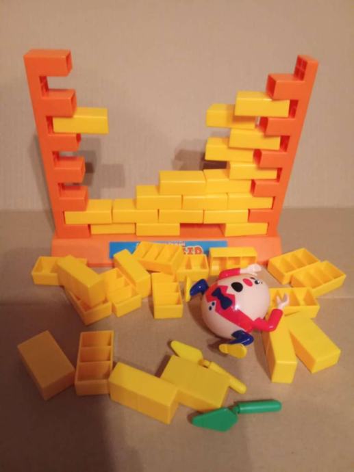 Društvena igra je kompletna i neoštećena i sastoji od postolja i 2 stupa unutar kojih se nalazi zid sačinjen od 44 cigle, žute i zene zidarske žlice + figura 'Hampti Dampti' !