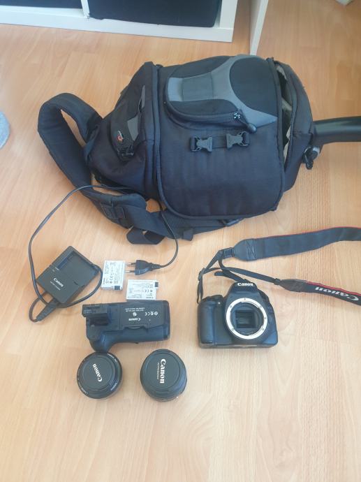 Fotoaparat je ocuvan, te idu uz njega dva objektiva, originalne dvije baterije, original punjac, drzac za stalak,te originalni ruksak