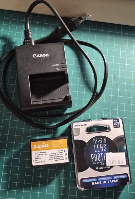 Uz fotoaparat ide njegov objektiv 18-55, x2 baterije, punjač te torbica.