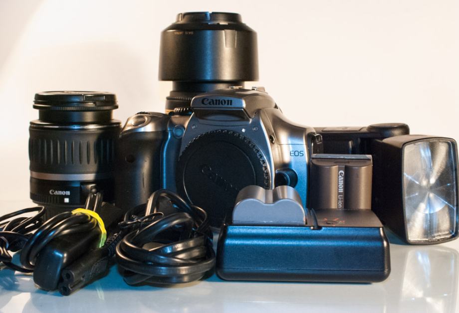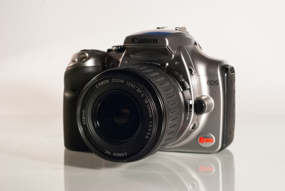 Prodajem očuvan DSLR aparat Canon 300D. Odličan izbor za početnika u DSLR fotografiji, pogotovu jer dolazi u kompletu s kit objektivom 18-55, teleobjektivom 55-200 mm, daljinskim okidačem, dvije baterije i dvije memorijske kartice CF kartice 2 GB i 256 MB.