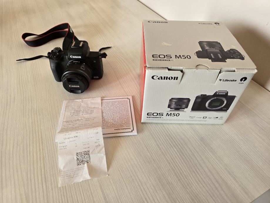 Na prodaju Canon EOS M50 s kit objektivom 15-45mm. Kamera je u odličnom stanju, minimalno korištena i savršeno očuvana. Idealan izbor za fotografiju i video, s izvrsnom kvalitetom slike, 4K snimanjem i kompaktnim dizajnom.