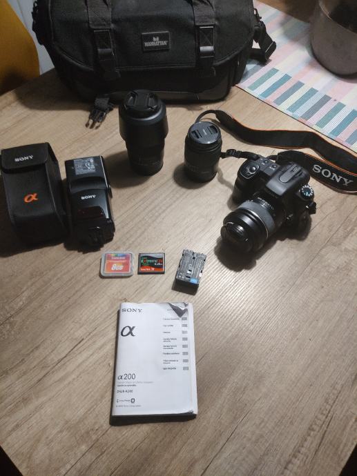 Prodajem SONY ALPHA A200 u kompletu dolazi sa 3 objektiva , bljeskalicom , 2 baterije, 2 memorijske kartice i svim kablovima te knjižicom sa uputsvima za upotrebu. Prodajem isključivo u kompletu, besplatna dostava za ZG.