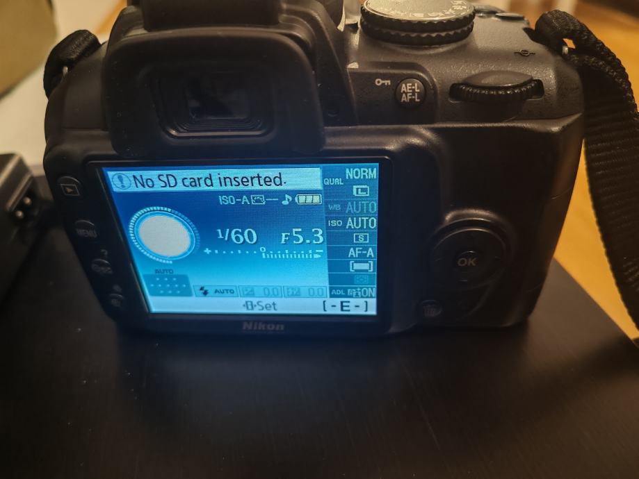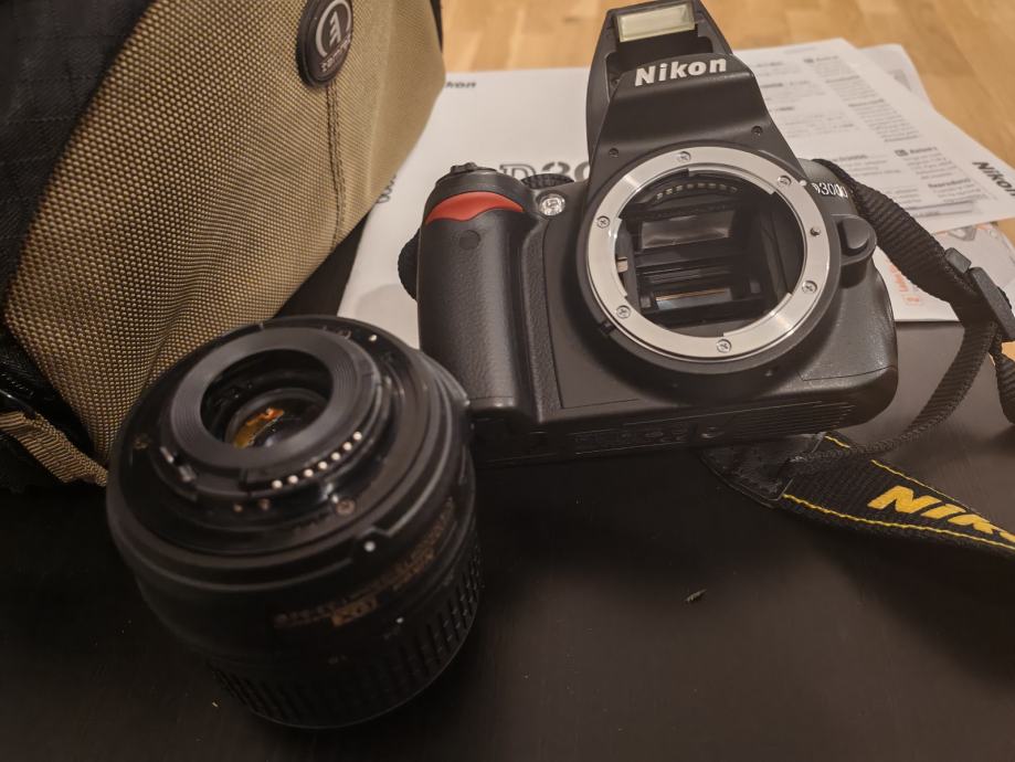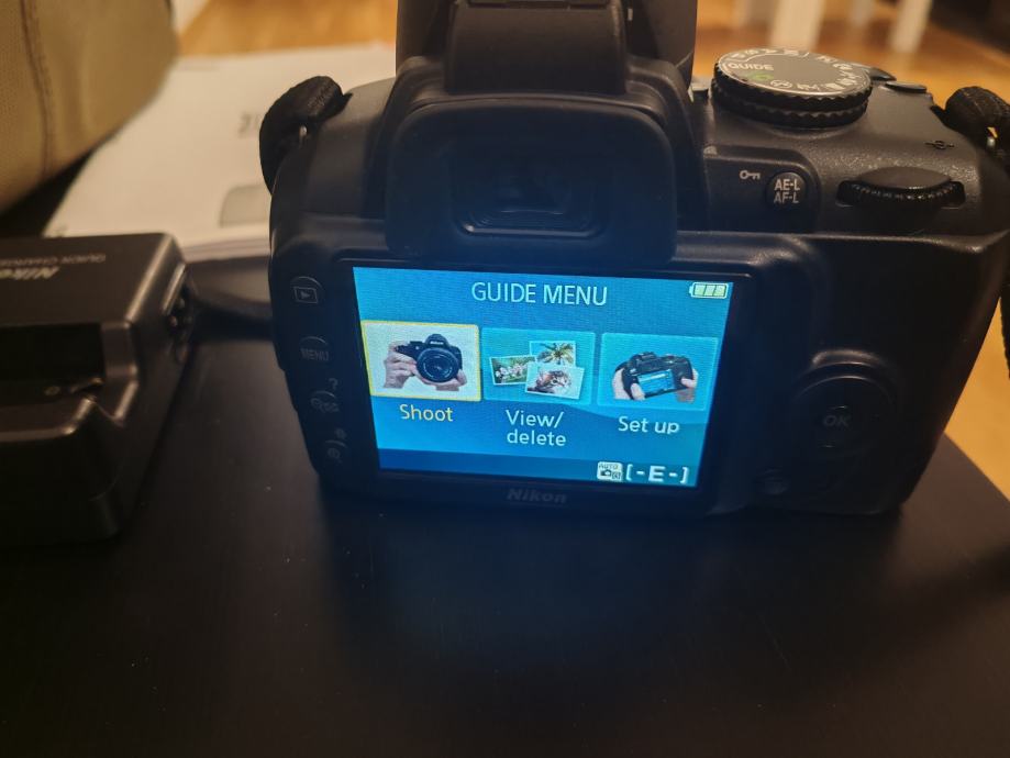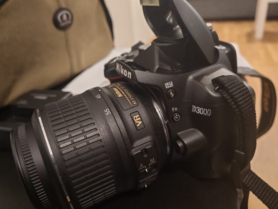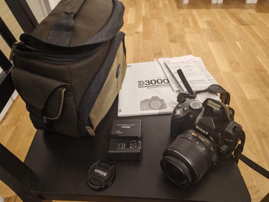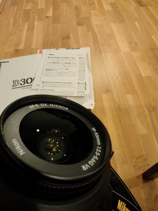 D3000 body, 18-55 originalni objektiv, baterija, punjač, treger, uputstva, torba. Svega 6446 fotki okinuto, aparat kao nov, bez greške