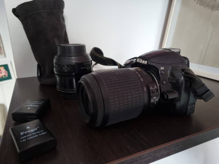 Nikon D3100 s originalnim objektivom Nikon Nikkor AF-S 18-55mm i teleobjektivom 55-200 mm.