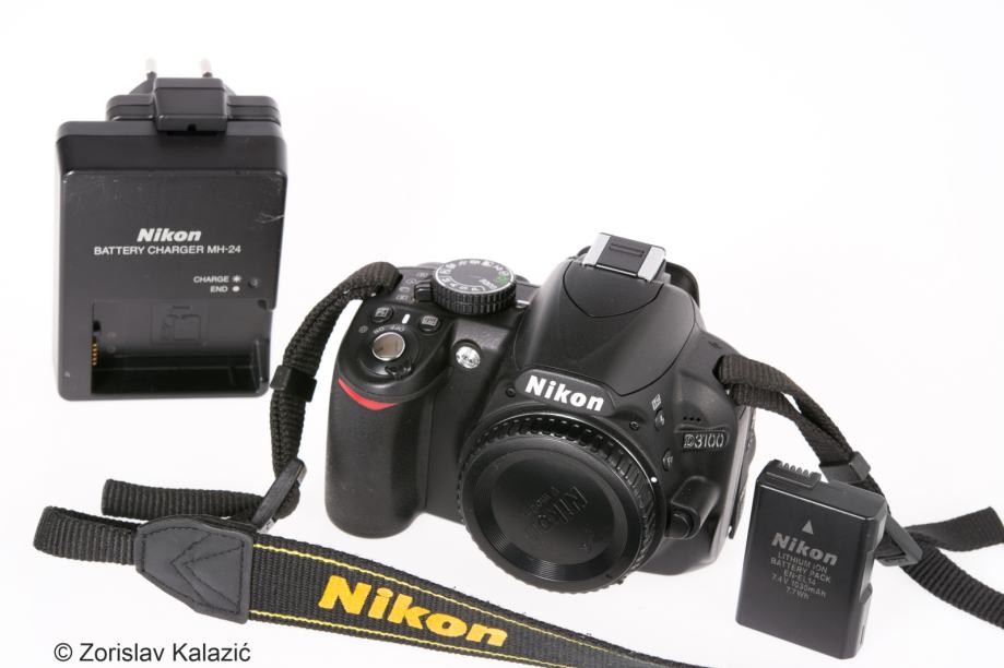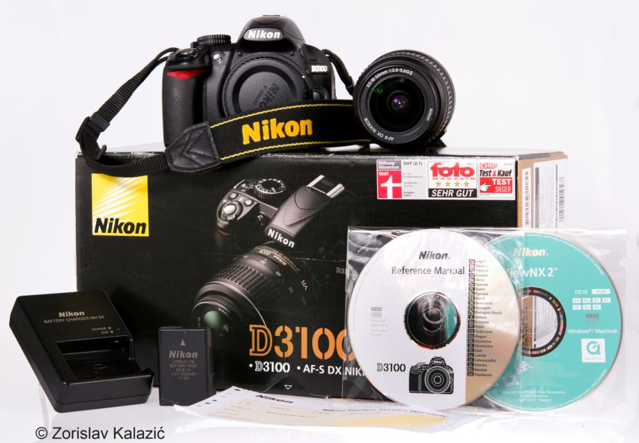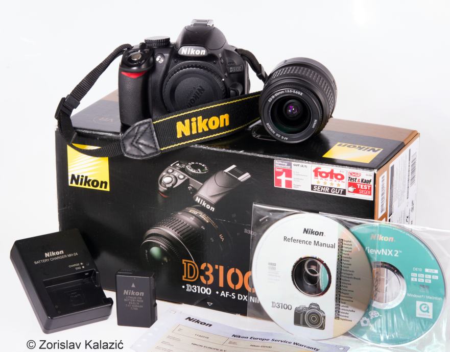 U setu dolazi kućište D3100, objektiv Nikon 18-55mm, Nikon remen, baterija i punjač za baterije - znači sve ono što je na originalnim fotografijama.