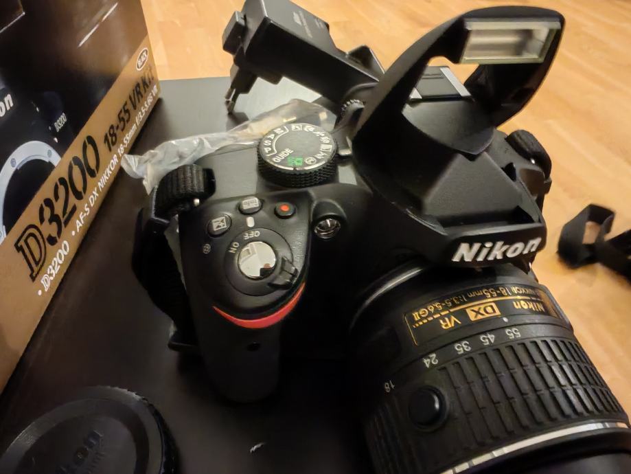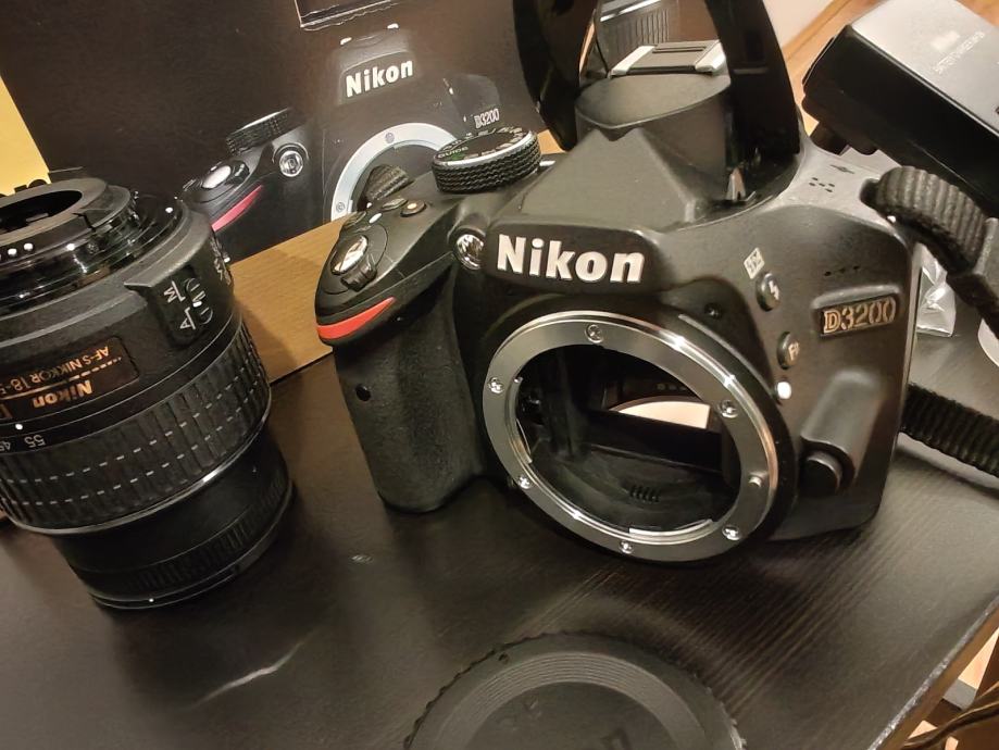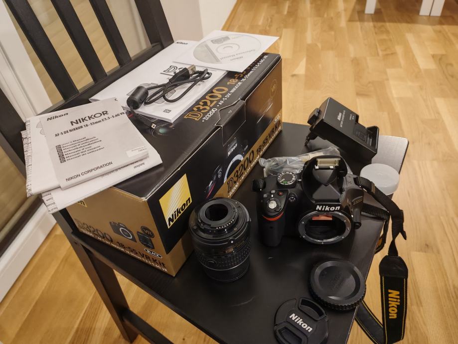 D3200 body, 18-55 originalni objektiv, punjač, baterija, treger, uputstva, originalna ambalaža, uputstva, software, poklopci objektiva i bodya, svega 11202 fotki okinuto.
