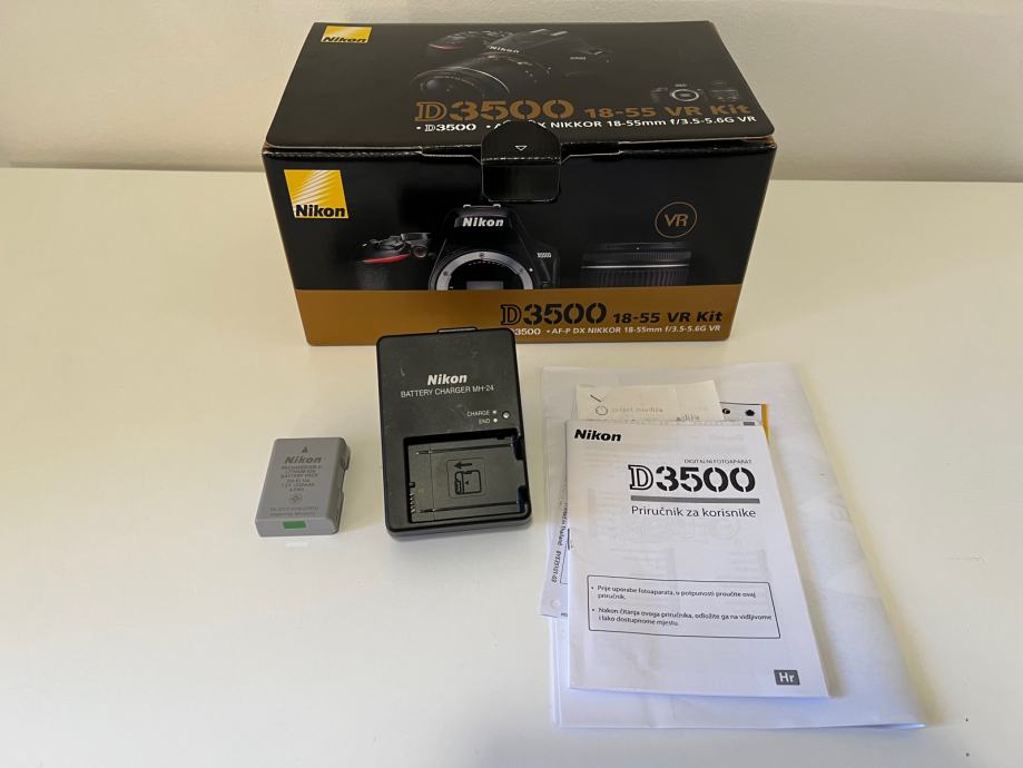 Prodajem Nikon D3500 s AF-P 18-55 VR Kit objektivom, drugi vlasnik, orginalno kupljen pocetkom 2020 u Svijet Medija.