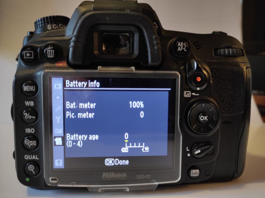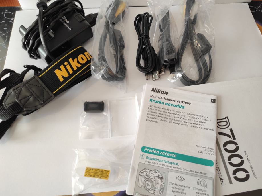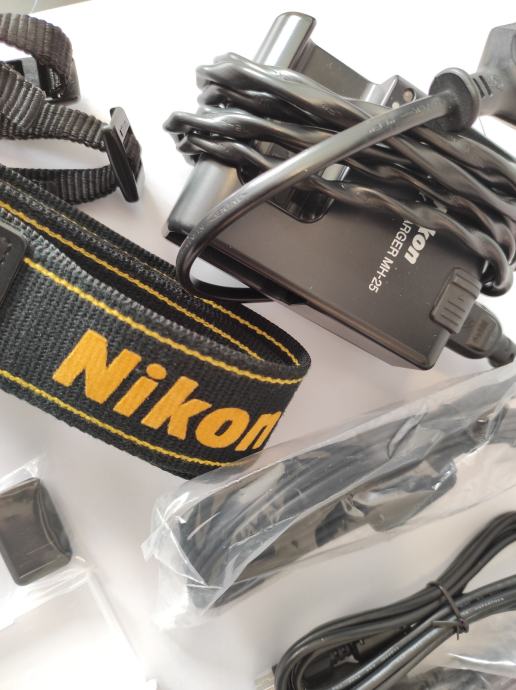 Uključen je: punjač baterije, poklopci, kabeli, original neck-strap nekorišten.