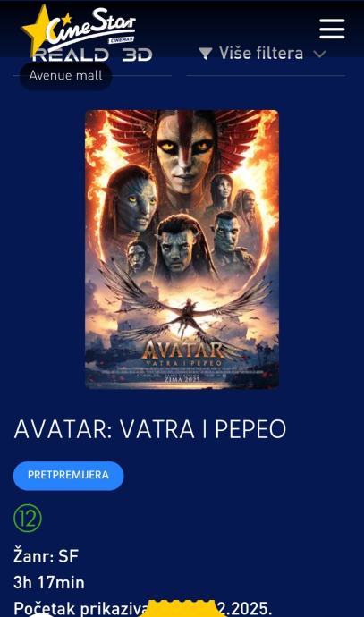 Projekcije igra u Cinestar Avenue Mall 17.12. 2025. u 20:15h