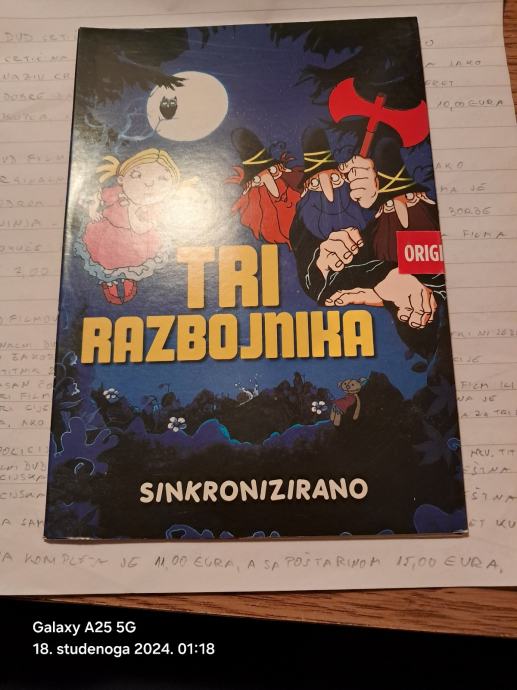 Naziv crtića Tri Razbojnika trajanje 70 minuta jako dobre zabave. Moguće slanje sa poštom na teret kupca. Cijena je 6.50 eura i fiksna je a sa poštarinom je 10.00 eura.