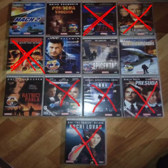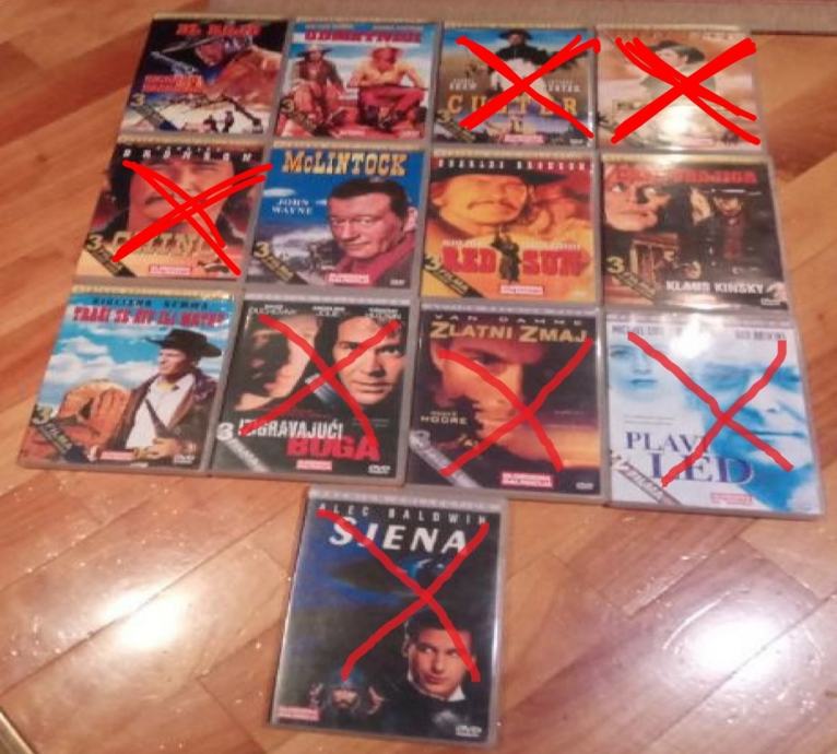 U ovom oglasu se prodaju DVD-i novinske naklade Slobodne Dalmacije sa po dva filma na DVD-u + crtani (na dva nema crtanoga). 9 DVD-a je kombinacija nekog Westerna i nekog filma, a ostala 4 su sa po dva filma koji nisu Western.