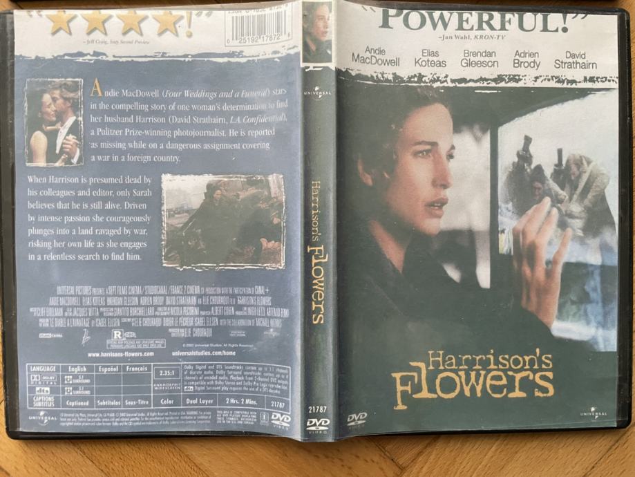 Iako napučen američkim glumačkim zvijezdama, među kojima je i dobitnik Oscara za najbolju glavnu mušku ulogu, Adrian Brody (Pijanist), "Harrisonovo cvijeće" je zapravo francuski film okrenut europskoj publici, koji ponovno aktualizira ratne zločine. Andie MacDowell ostvarila je iznimnu ulogu žene koja u potrazi za suprugom zanemaruje djecu i posao, uvjerena kako bez suprugova prestaje i njezin život.